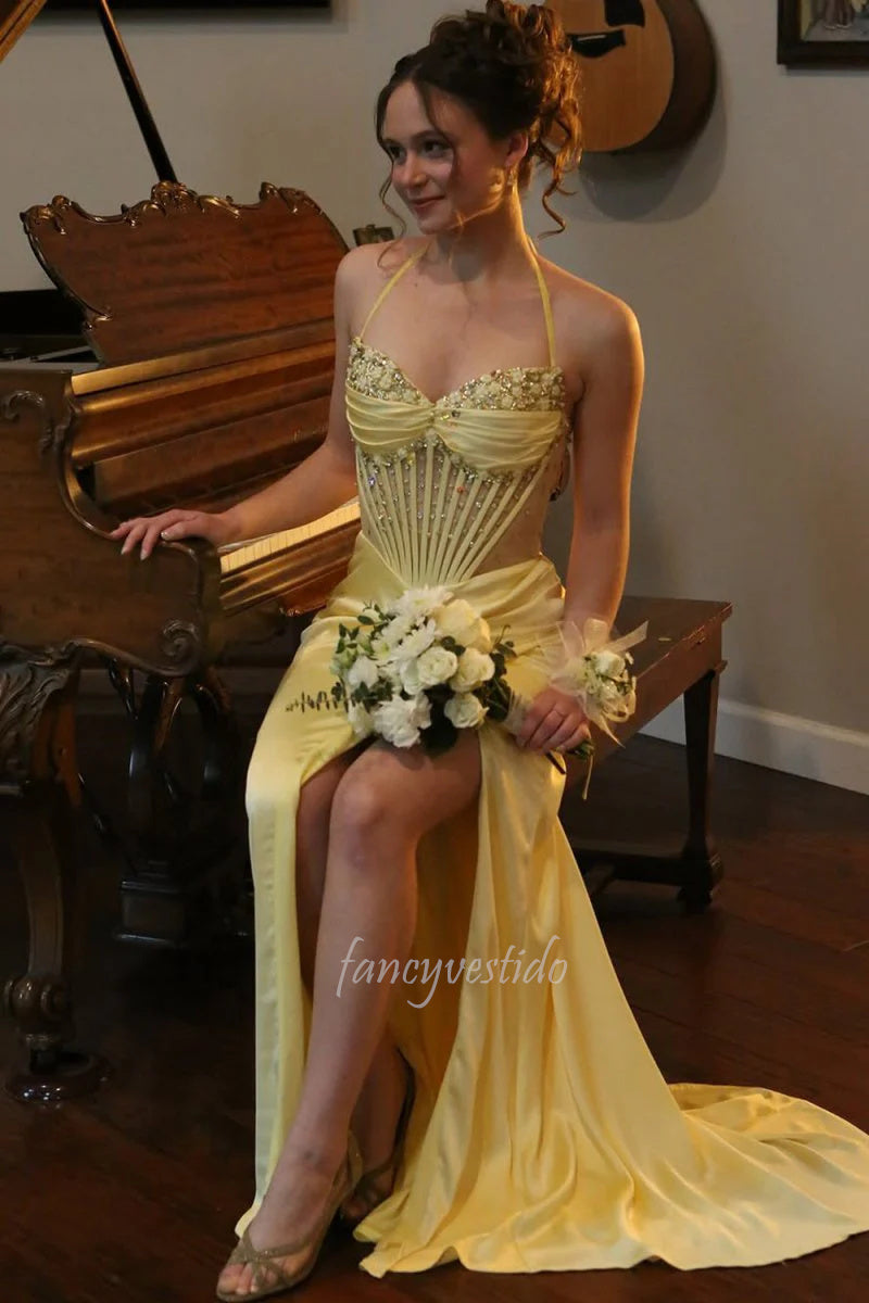 Radiate sophistication in this elegant yellow halter prom dress, featuring a structured corset bodice with boning that delivers impeccable shaping and support. Intricate beading adorns the design, catching light with every movement and adding refined sparkle to your silhouette. The halter neckline provides secure, flattering support while emphasizing the neckline and shoulders. Perfect for prom, formal celebrations, or black-tie occasions, this gown combines architectural precision with luxurious embellishment for a truly show-stopping appearance.