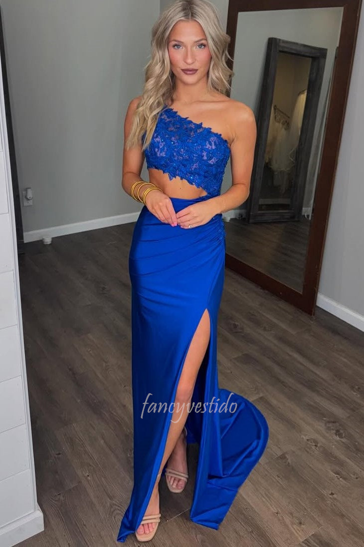 One Shoulder Applique Cutout Mermaid Prom Dress with Slit