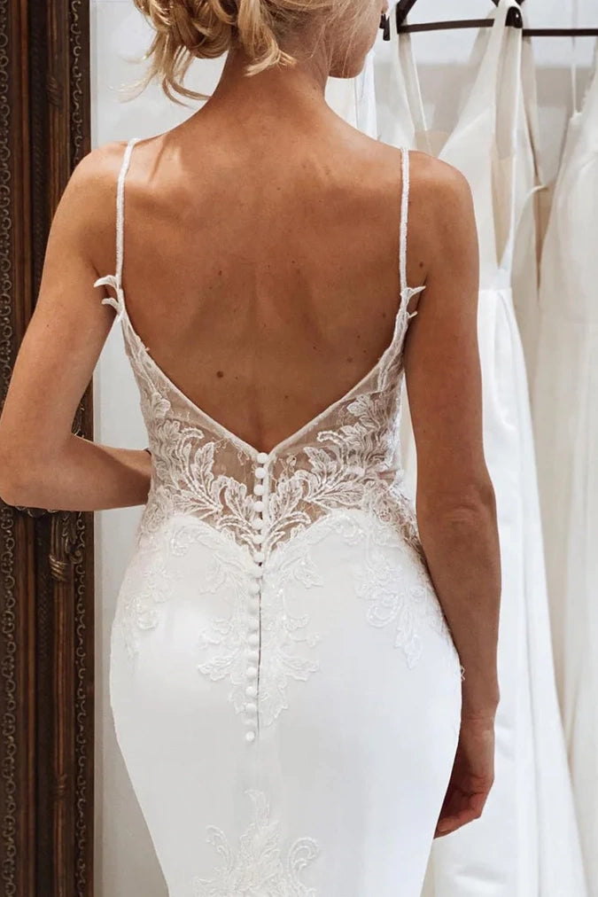 V-Neck Backless Lace Appliques Satin Mermaid Wedding Dress