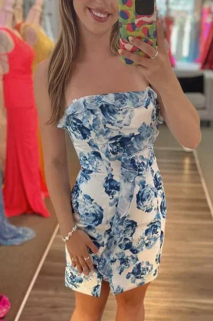 Strapless Blue Floral Print Mini Dress with Ruffles