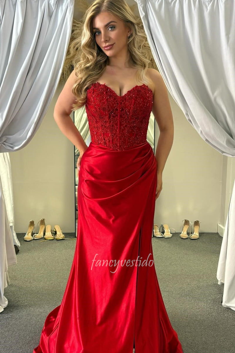 Red Sweetheart Lace Corset Bodice Satin Prom Gown with Slit