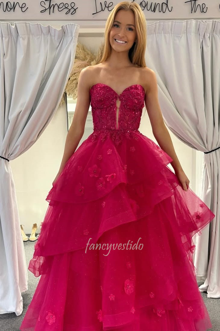 Magenta Sweetheart Applique Corset Prom Dress with Floral