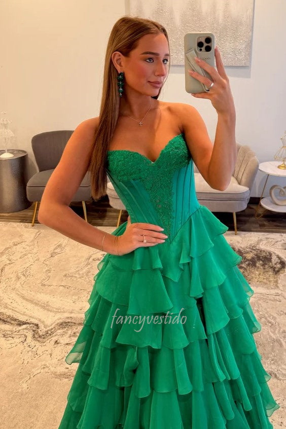 Emerald Green Strapless Tiered Ruffle Chiffon Slit Prom Dress