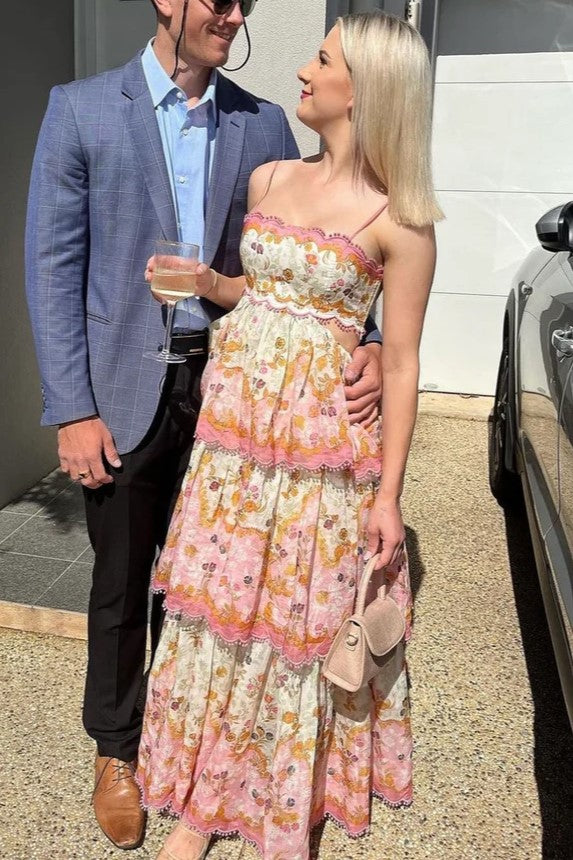 Straps Floral Print Ruffle Long Summer Dress with Lace-up Back