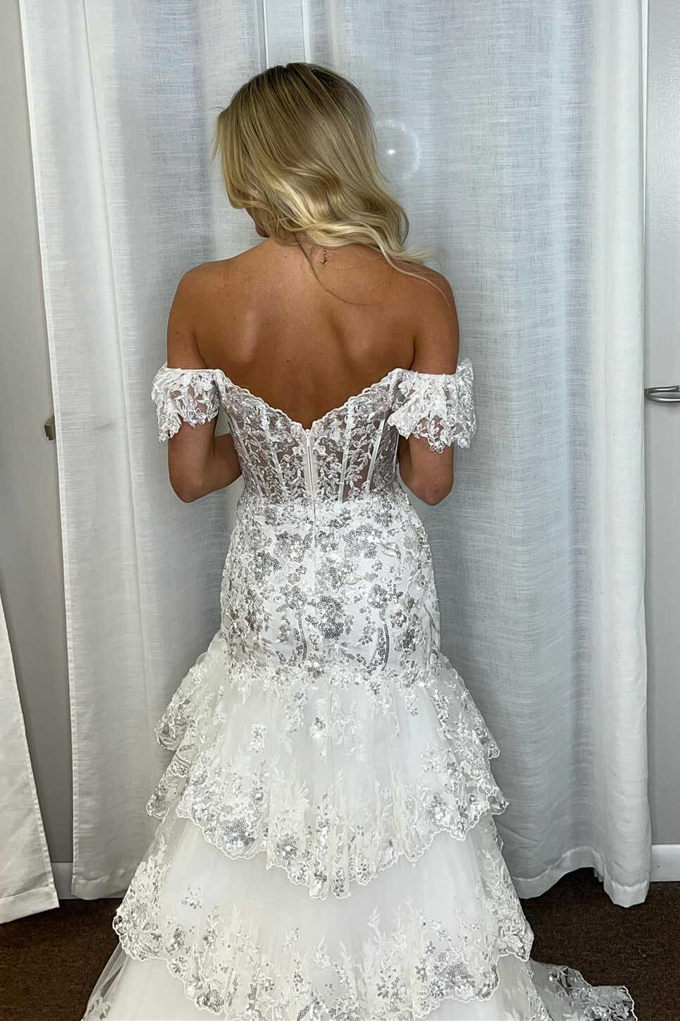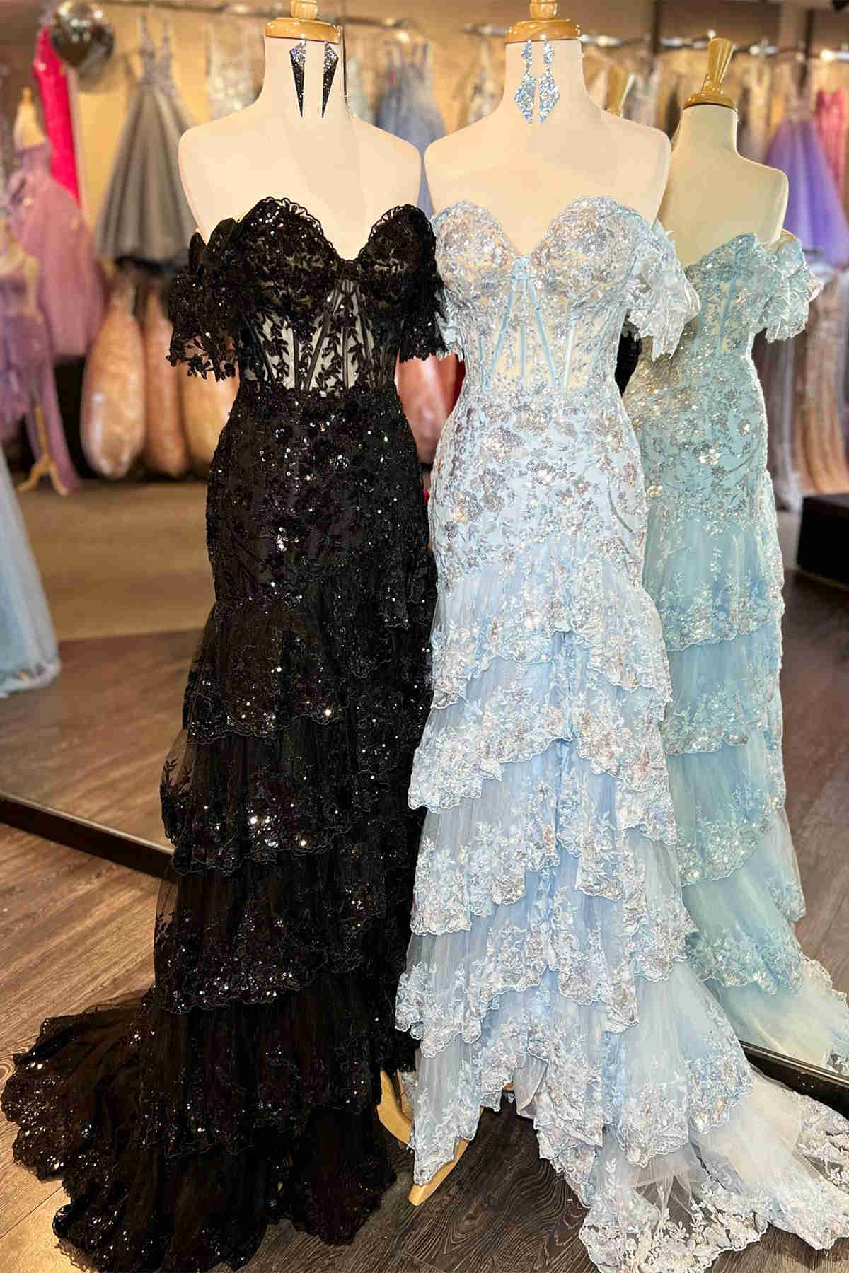 This mermaid silhouette dress features off the shoulder neckline, a fitted sequin bodice with tiered skirt, and a zipper back.