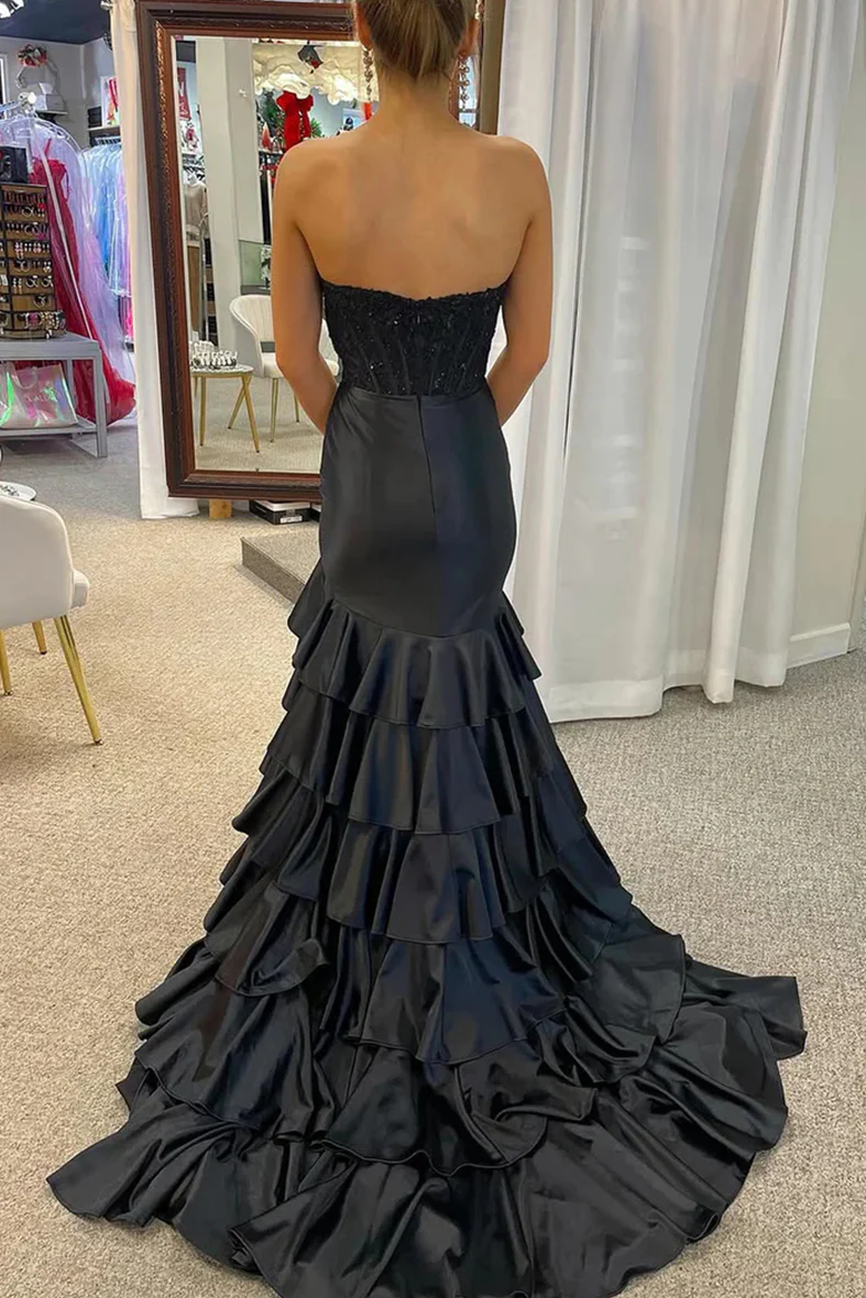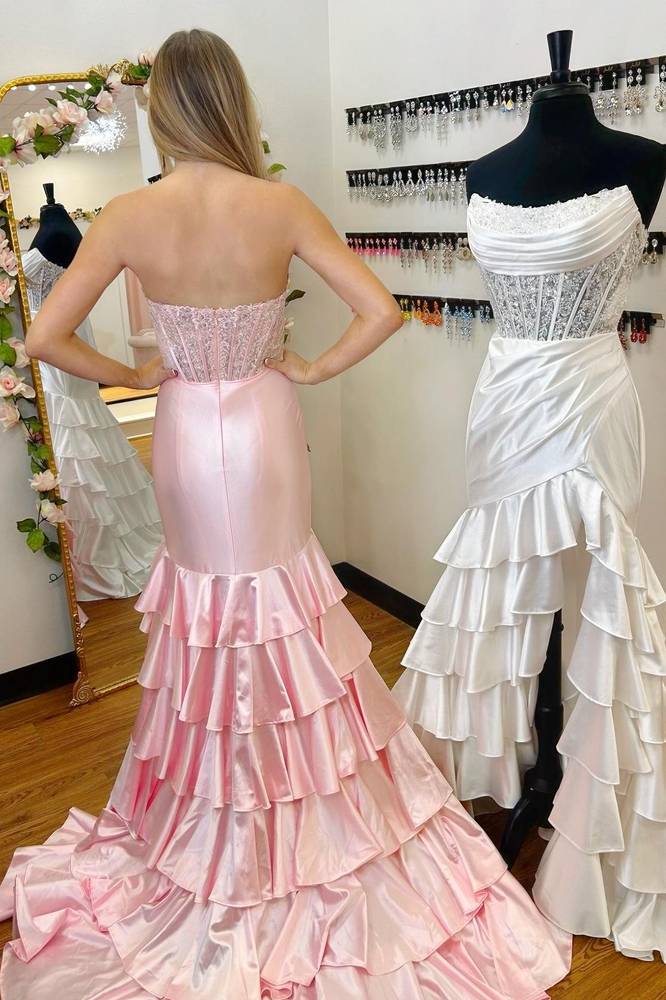 Pink Strapless Applique Ruffle Mermaid Prom Dress with Slit