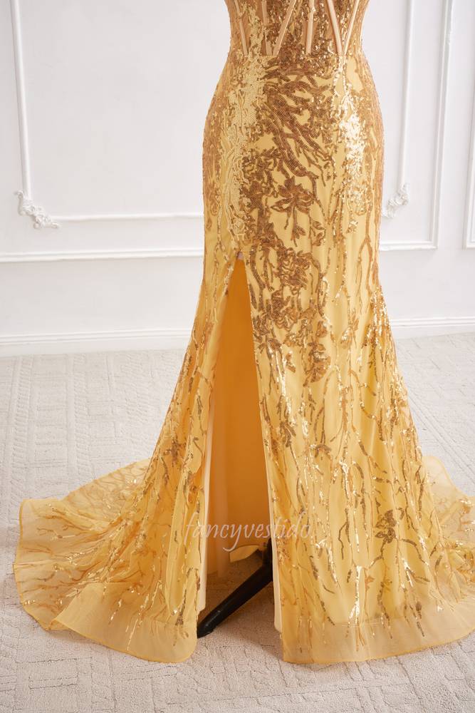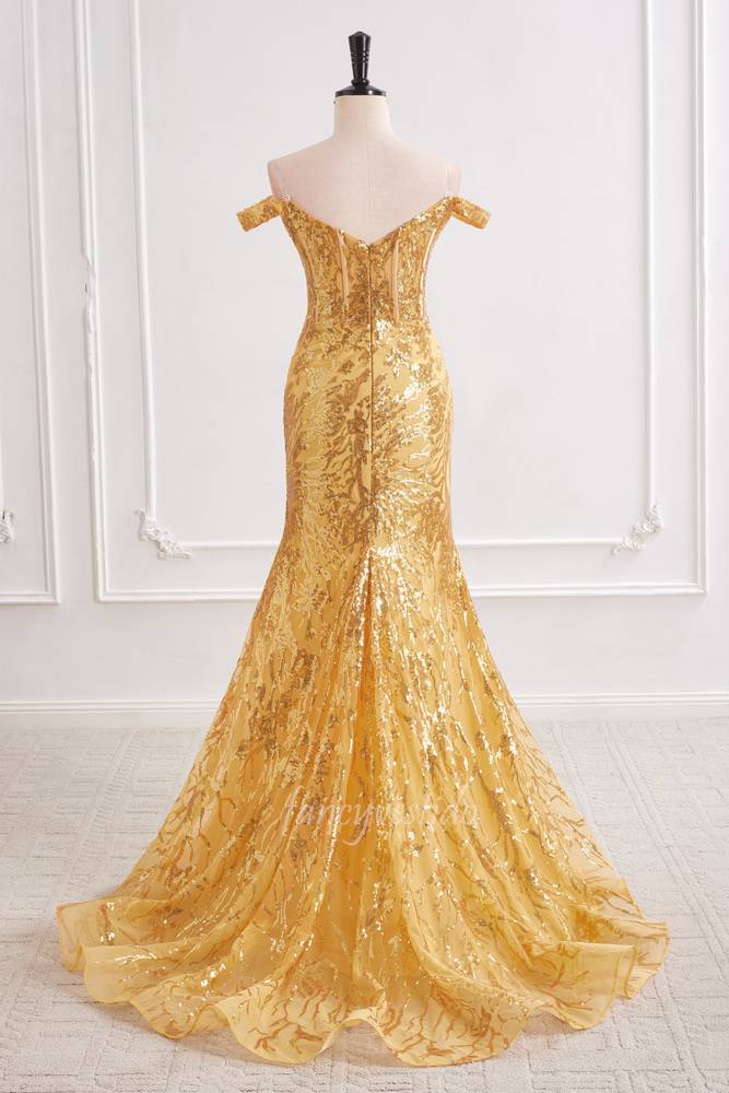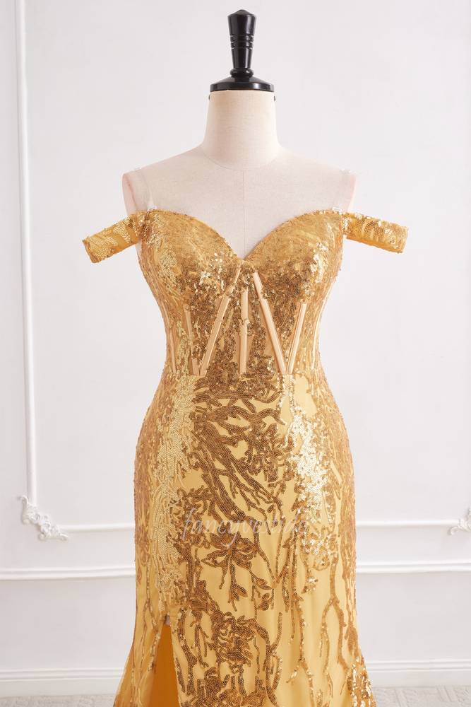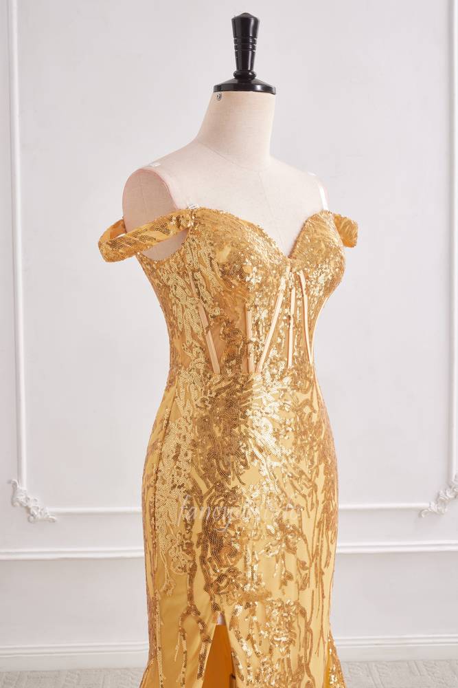 Gold Sequin Slit Mermaid Prom Dress with Off Shoulder