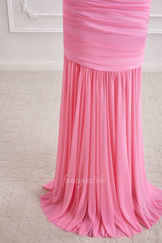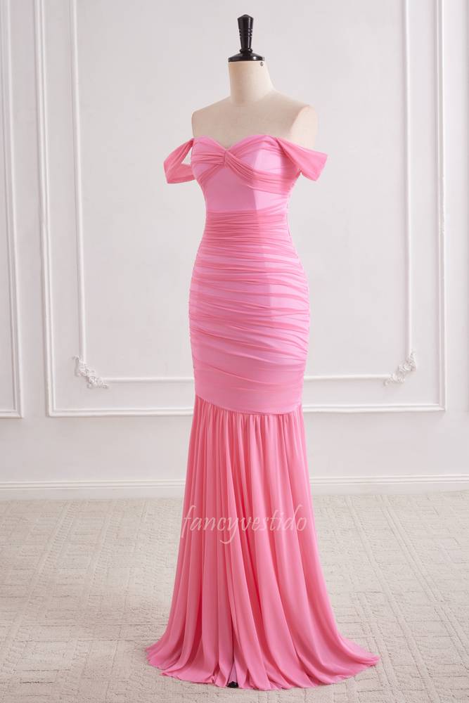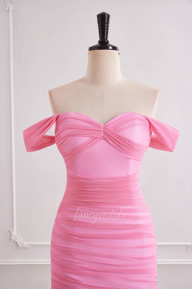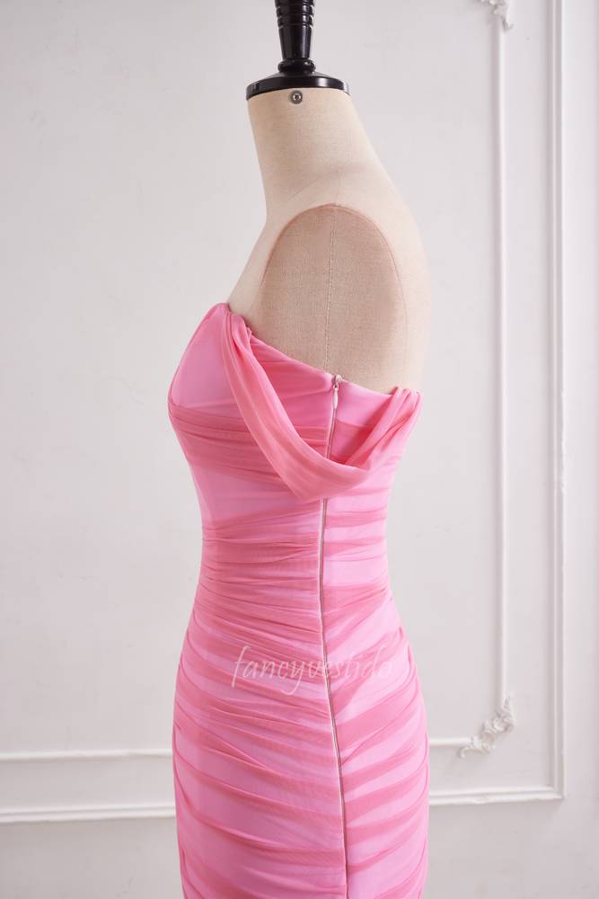 Pink Off Shoulder Ruched Sheath Layered Prom Dress