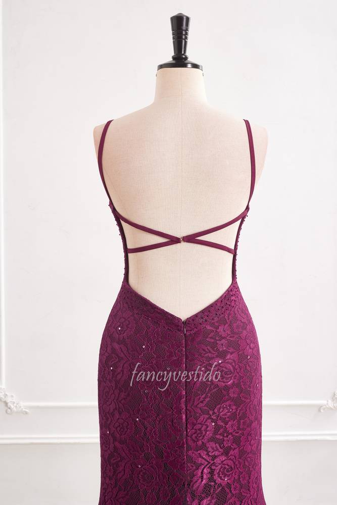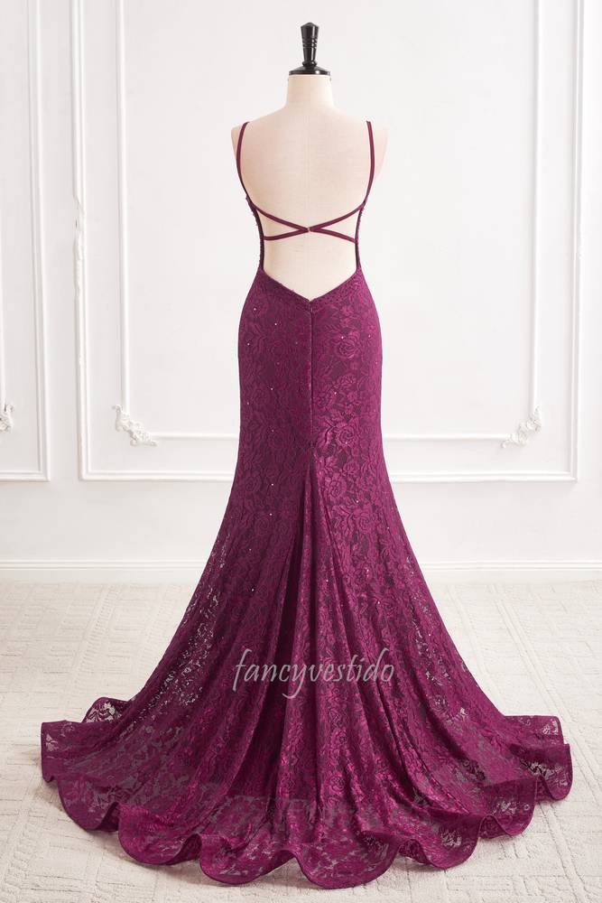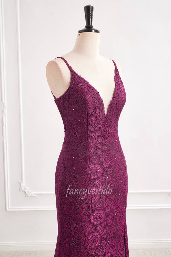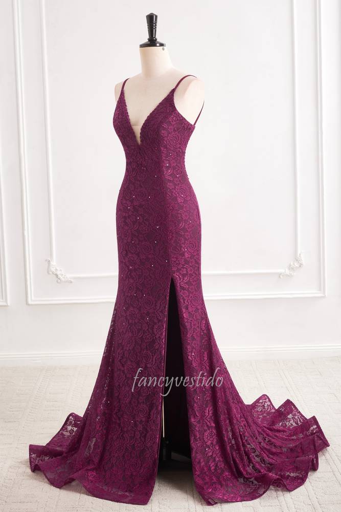 Purple Straps V-Neck Lace Slit Mermaid Evening Prom Dress