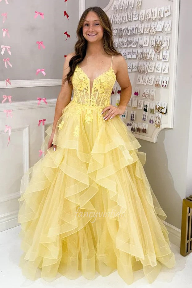 Princess Straps V-Neck Yellow Applique A-Line Ruffled Prom Dress
