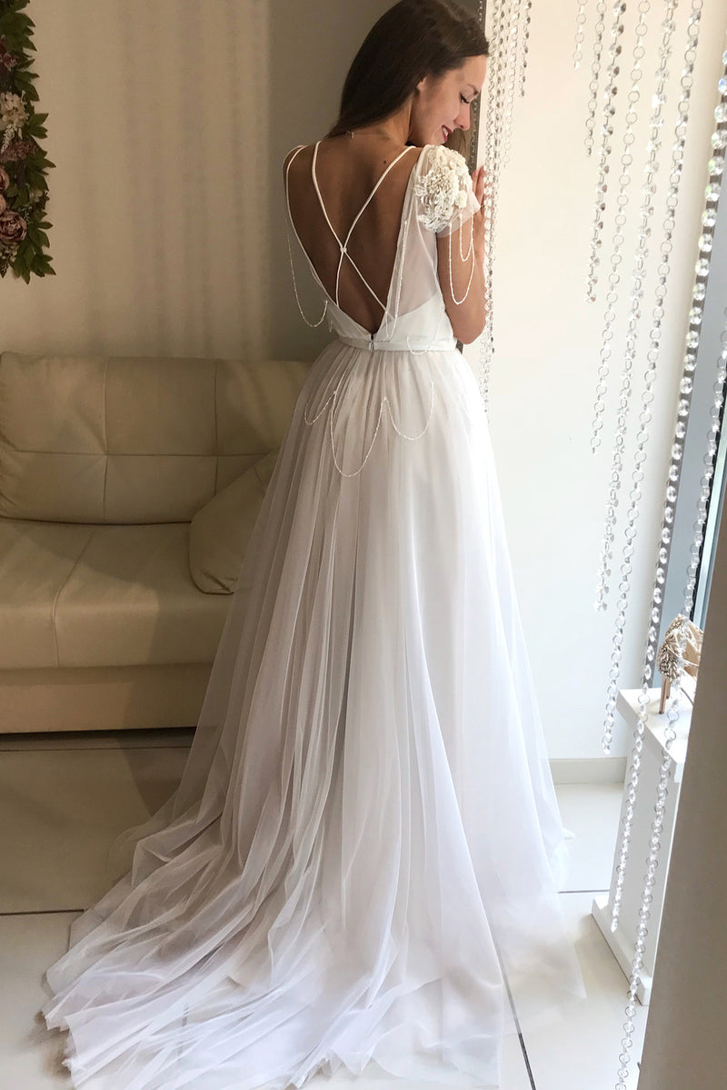 Sparkly A-line Long Deep V-Neck Princess White Wedding Dress