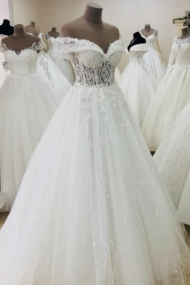 Princess Long A-line Off Shoulder White Bridal Gown with Lace Top