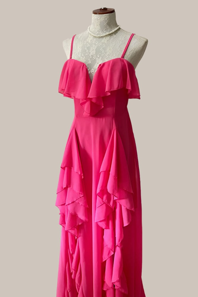 V-Neck Straps Hot Pink Ruffle Maxi Dress with Slit
