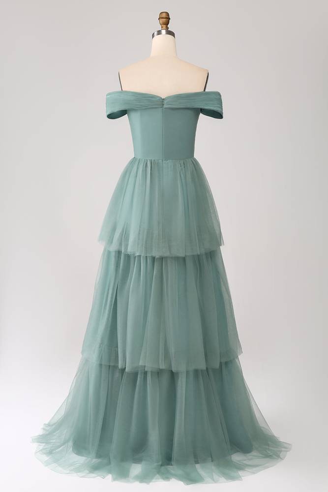 Off the Shoulder Dusty Green Layered Tulle Maxi Dress