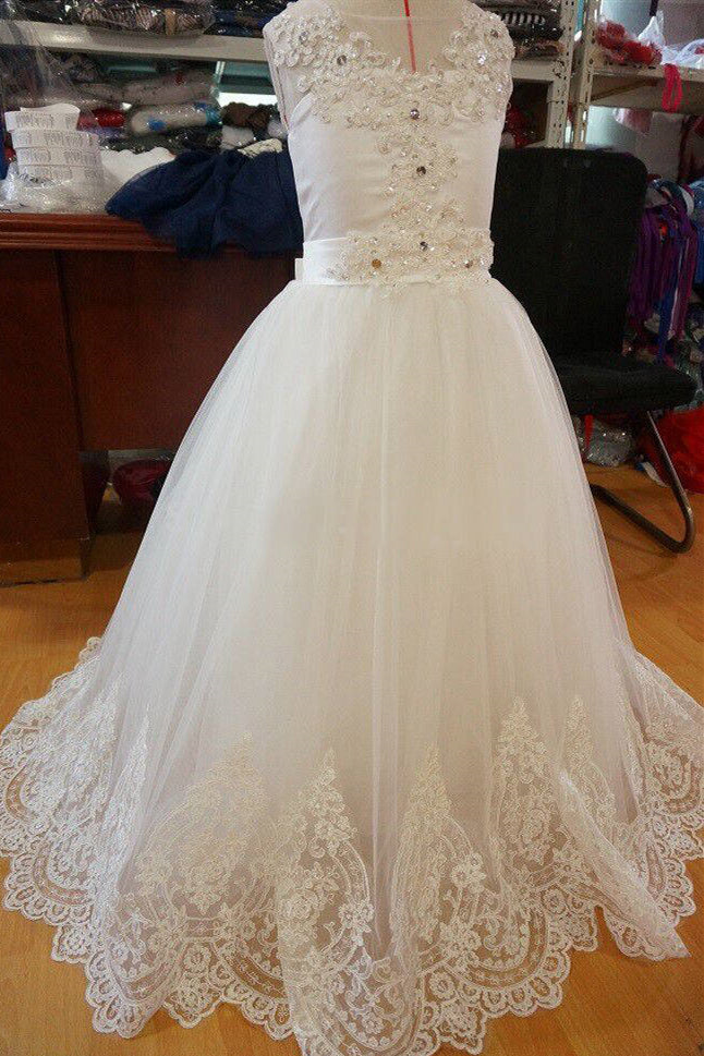 Chic Lace Edge Beaded Ivory Flower Girl Dress with Bow