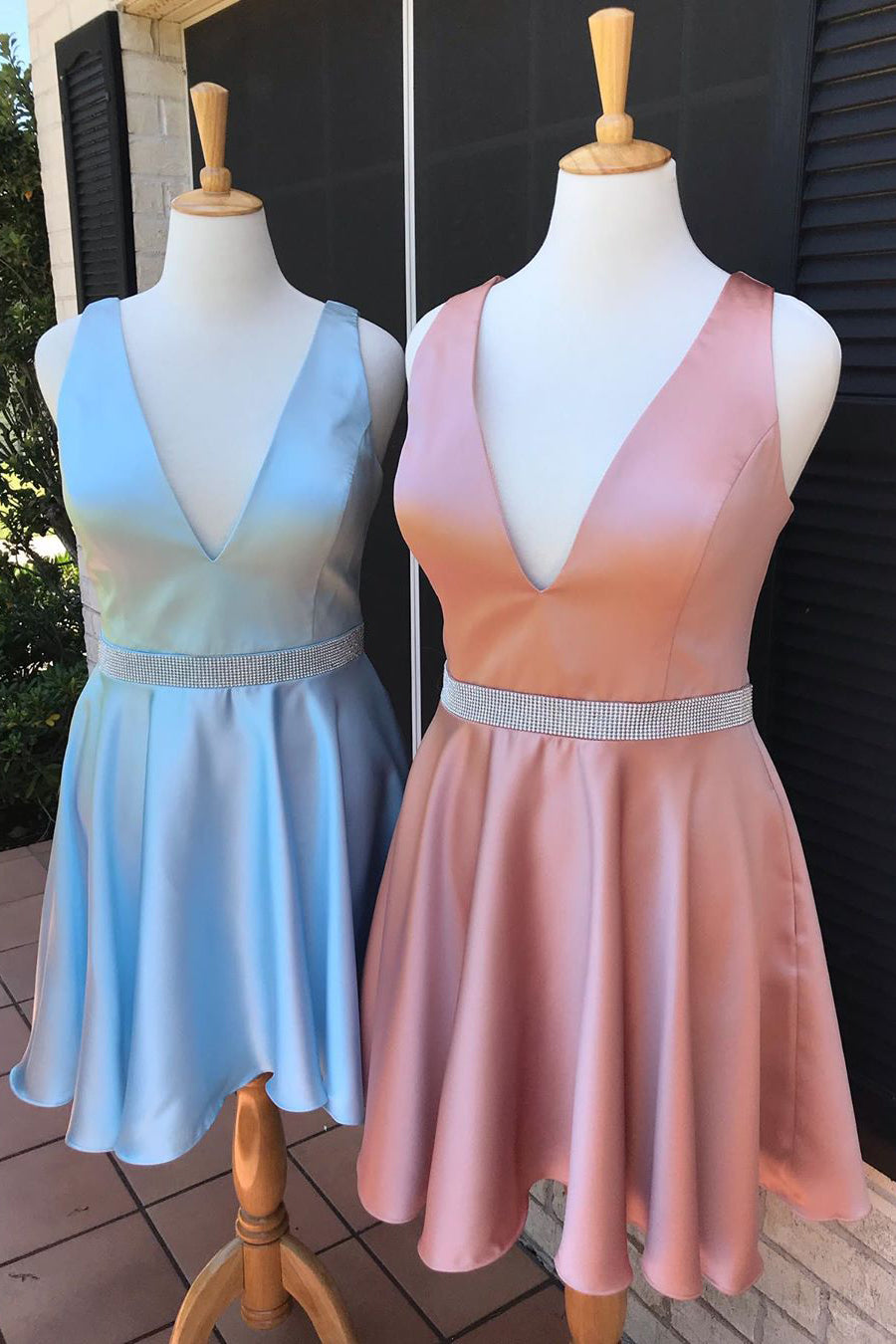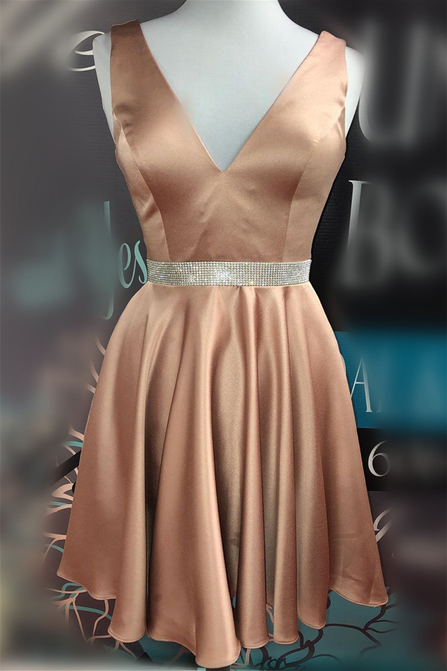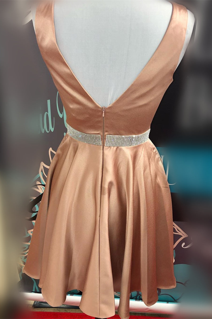 Deep V Pink Satin Homecoming Dress with Beaded Belt