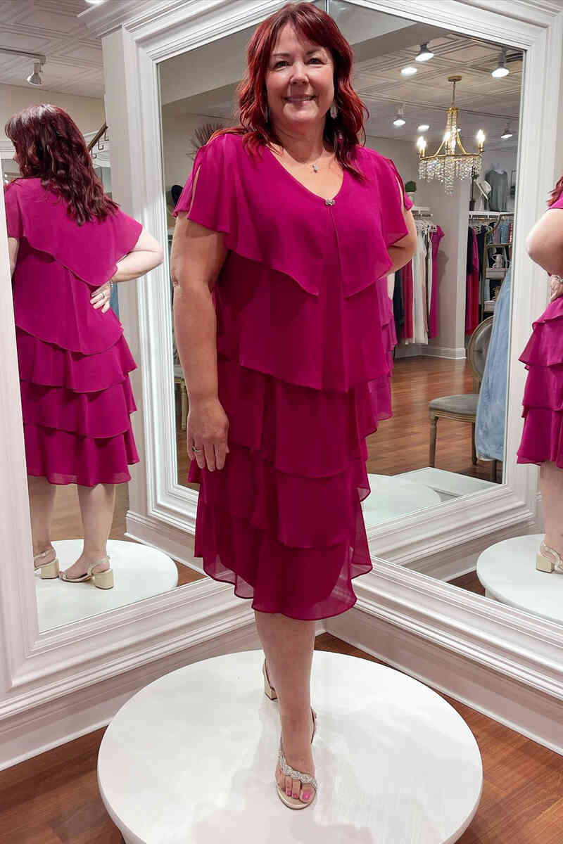 Elegant magenta mother of the bride dress features v-neck, multi tiered skirt and zipper back.