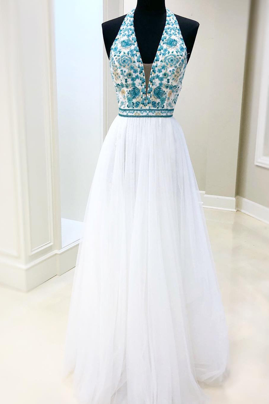 This elegant a-line white long prom dress features halter and floral embroidery. Our dresses have a good quality, but Inexpensive.