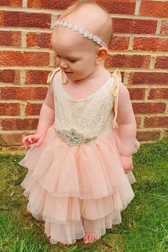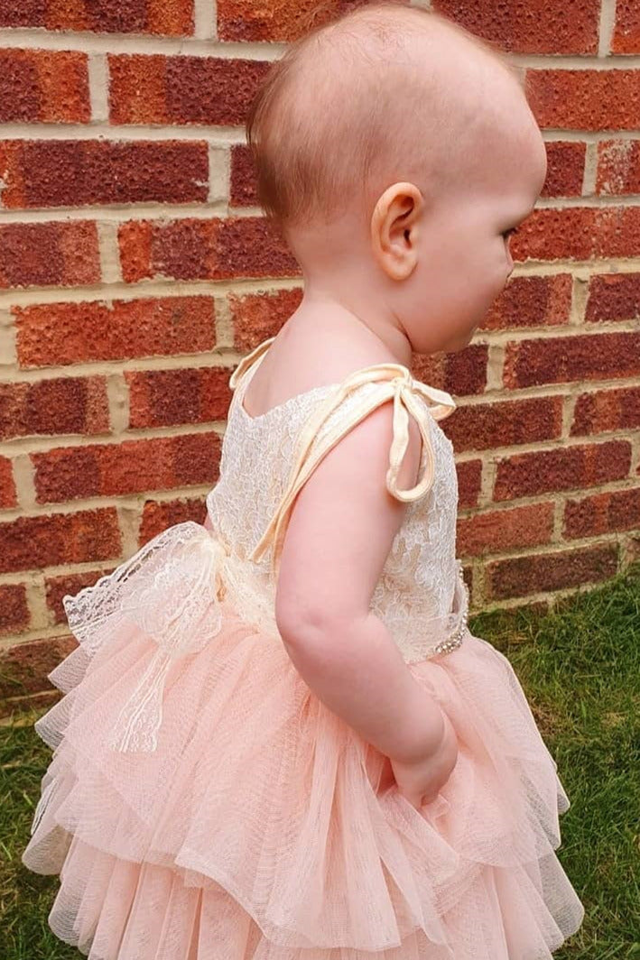 Toddler gold and pink flower girl dress with lace appliques and beads