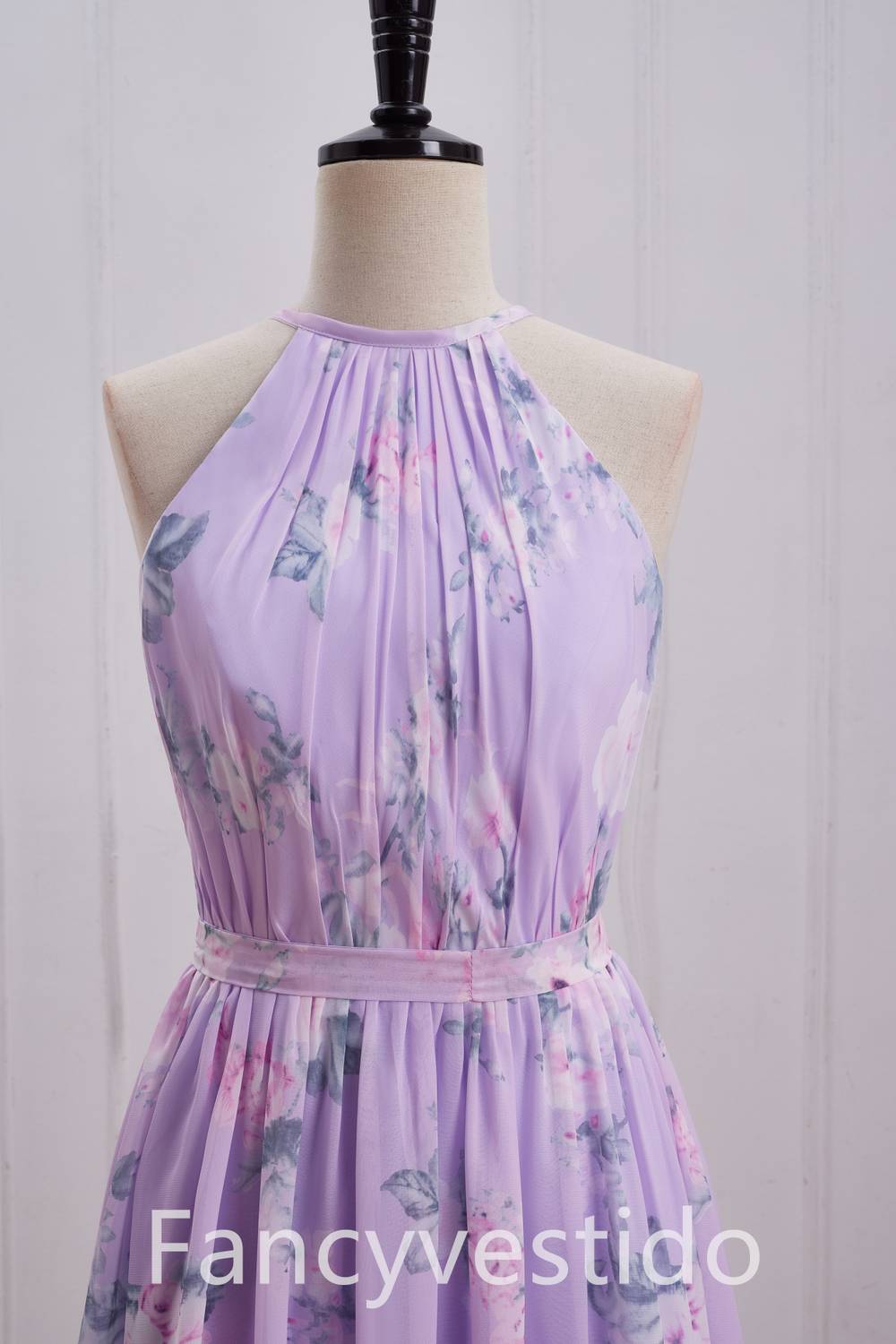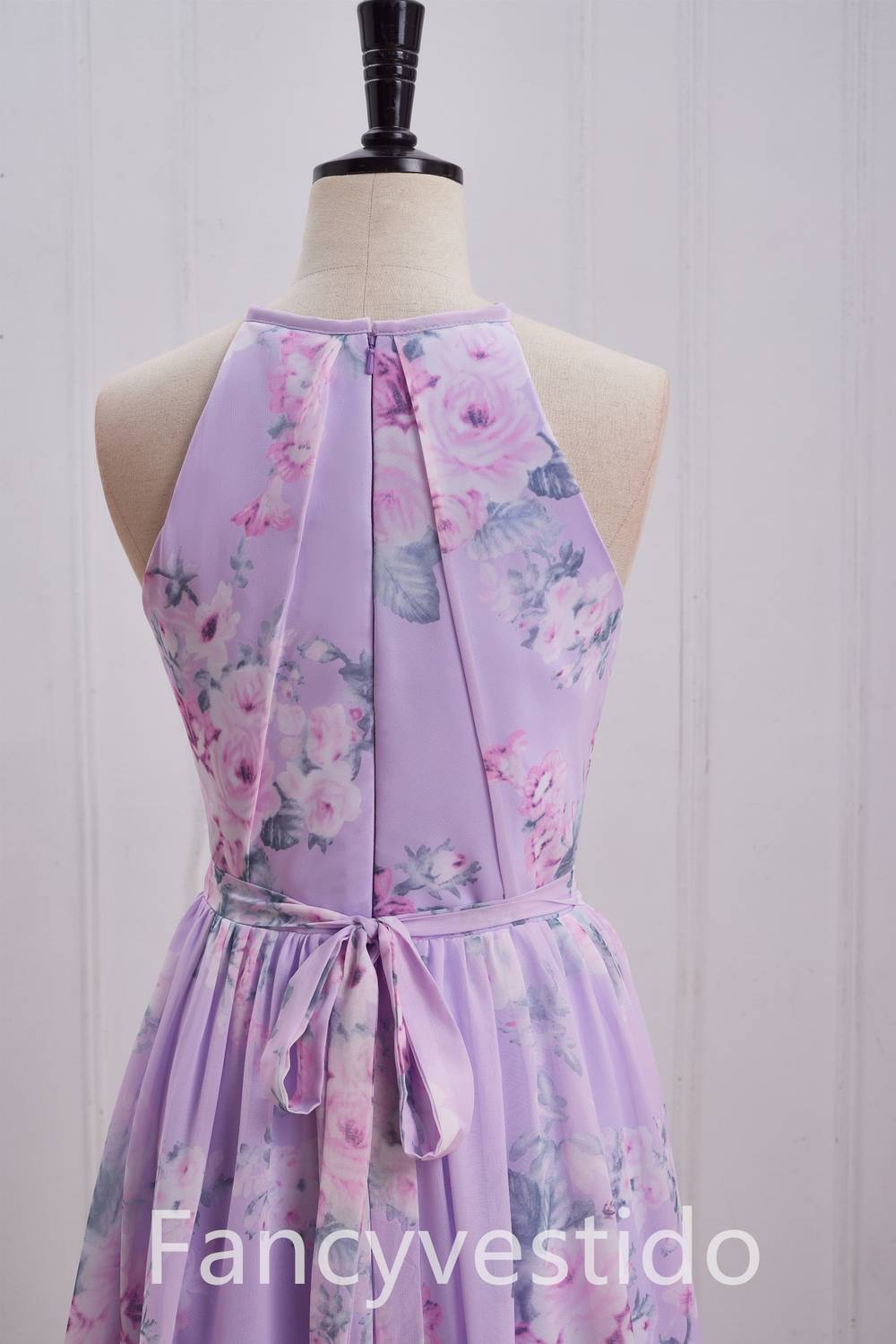 Halter Purple Floral Print A-Line Chiffon Bridesmaid Dress