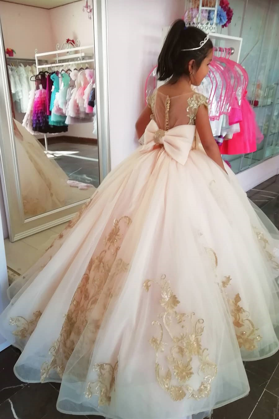 Princess a-line champagne flower girl dress with gold appliques and bow knot.