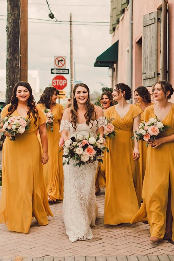 A-line long mustard yellow bridesmaid dresses with short sleeves and v neckline.