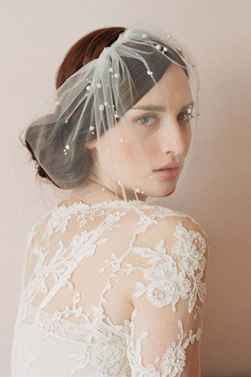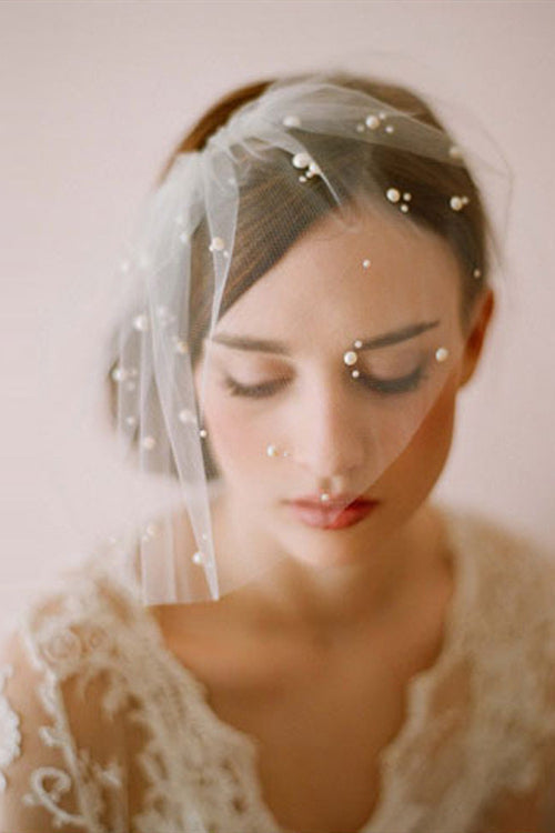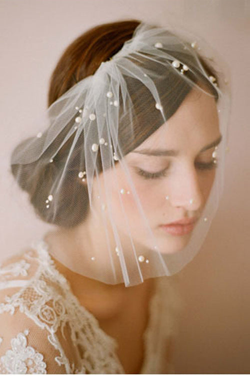 Short White Bridal Veil with Pearls