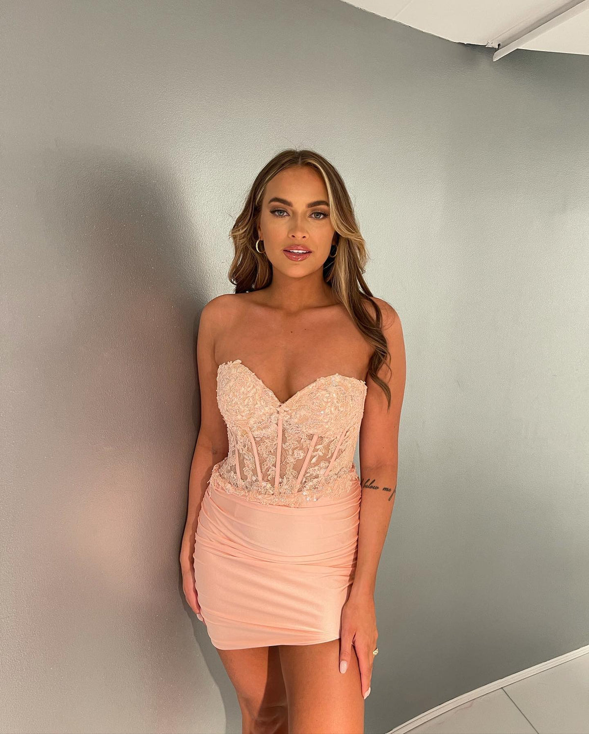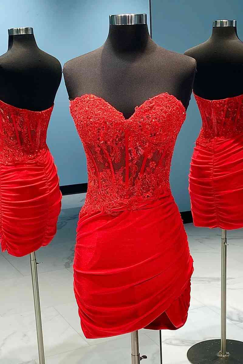 This tight short homecoming dress features sweetheart neckline, lace appliques and zipper back.